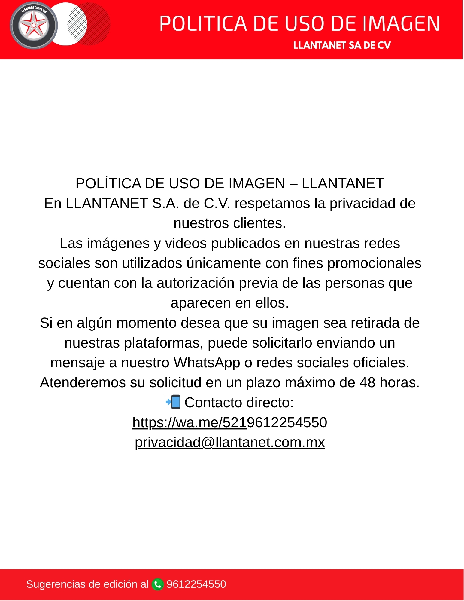 En LLANTANET S.A. de C.V. respetamos la privacidad de nuestros clientes.